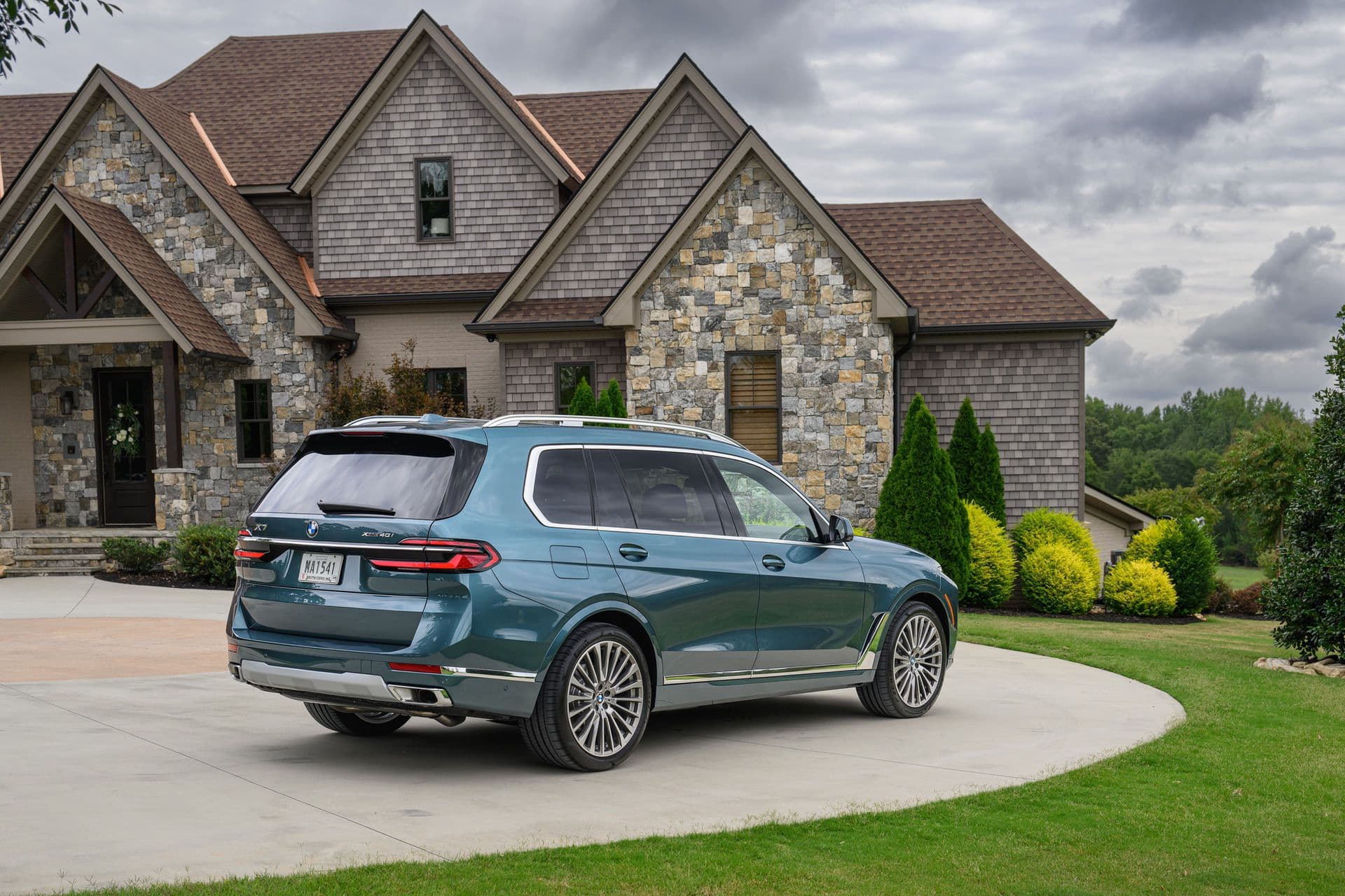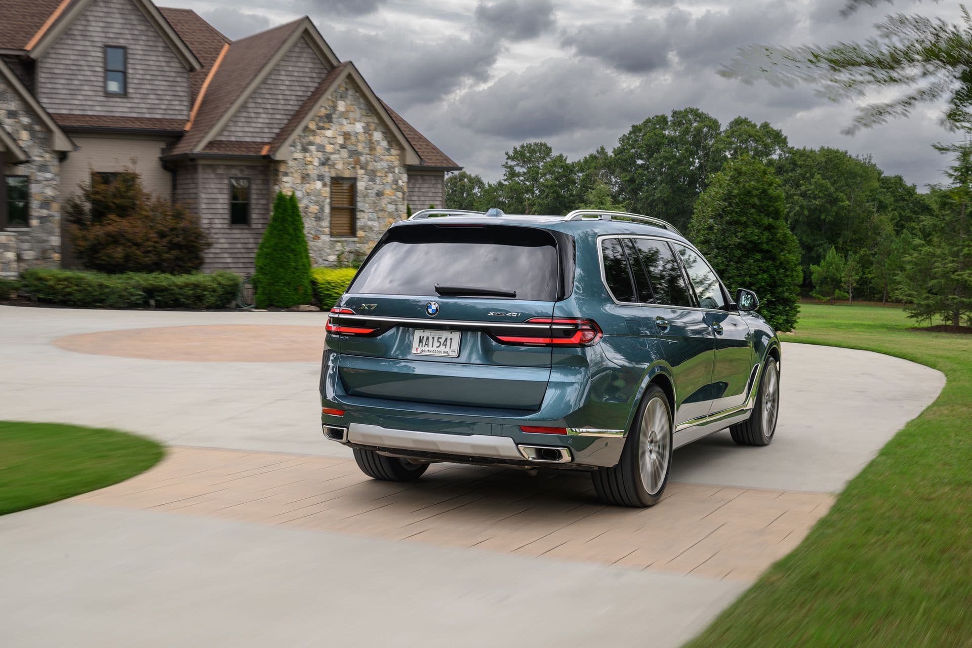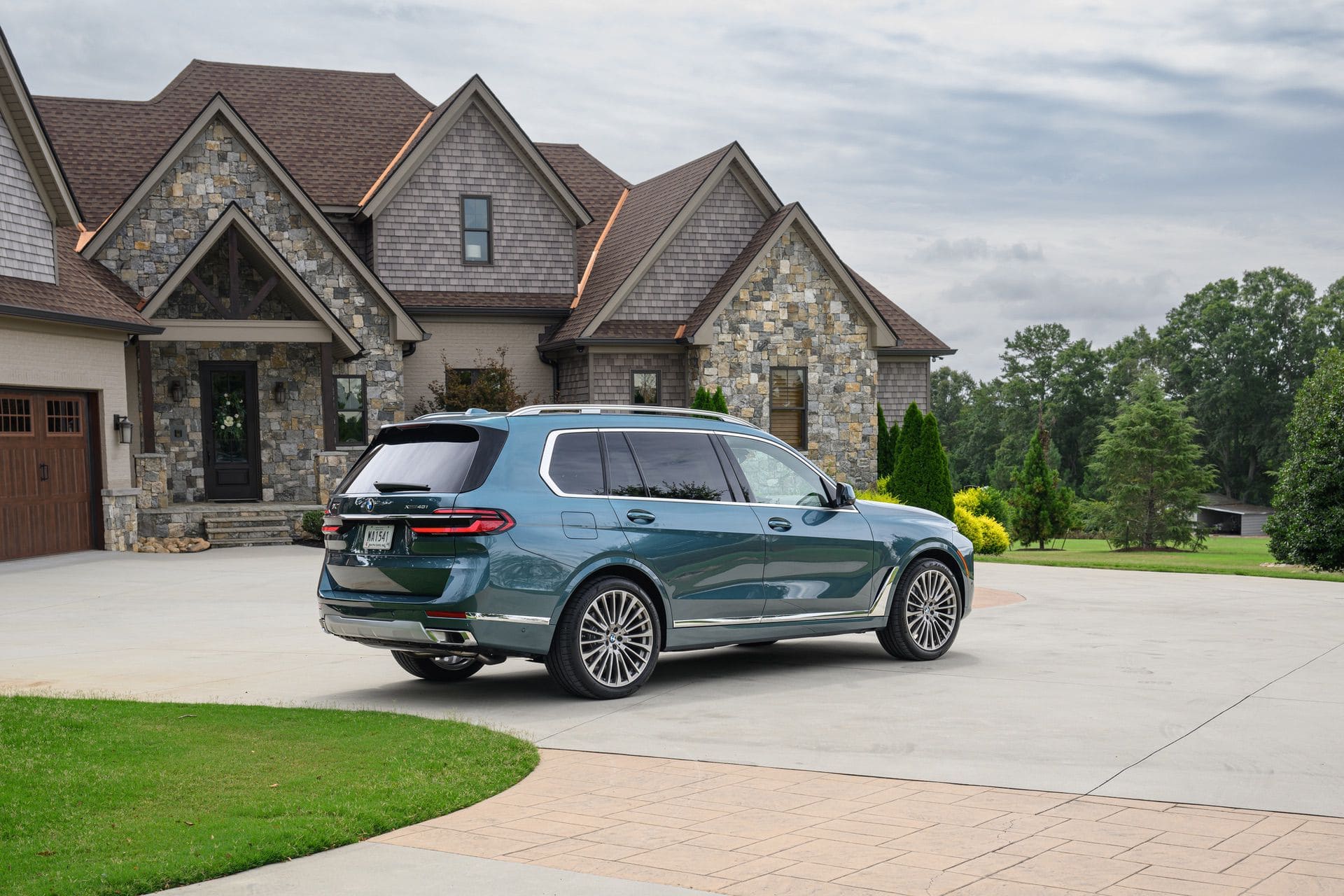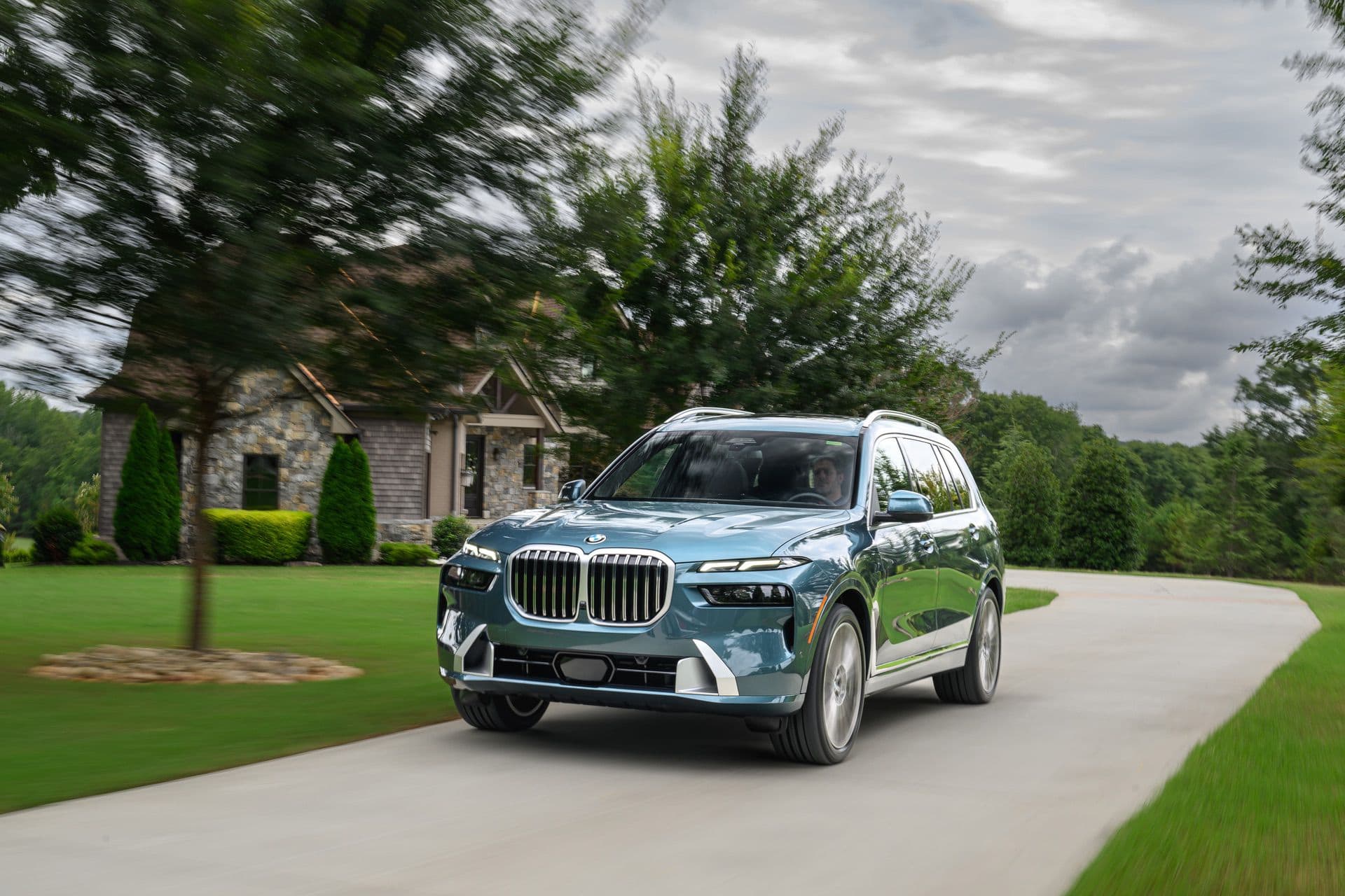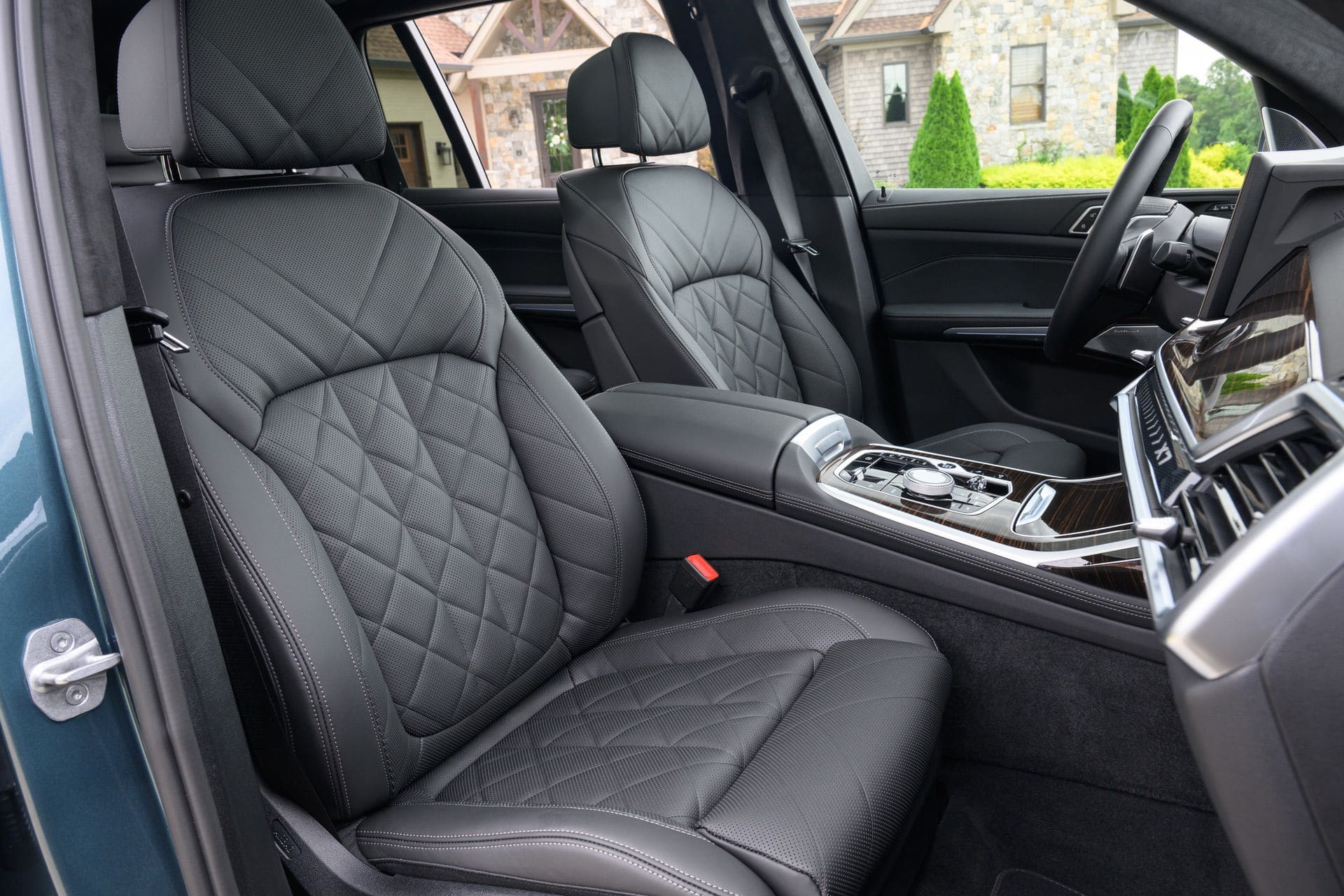 The BMW X7 in this photo gallery is wearing a Blue Ridge Mountain Metallic paint, which is named after the Blue Ridge Mountain range that runs near BMW’s Spartanburg, South Carolina plant. It’s a pretty color that works well with the X7’s enormous size. Inside, it’s black with wood accents and all of the X7’s new tech.