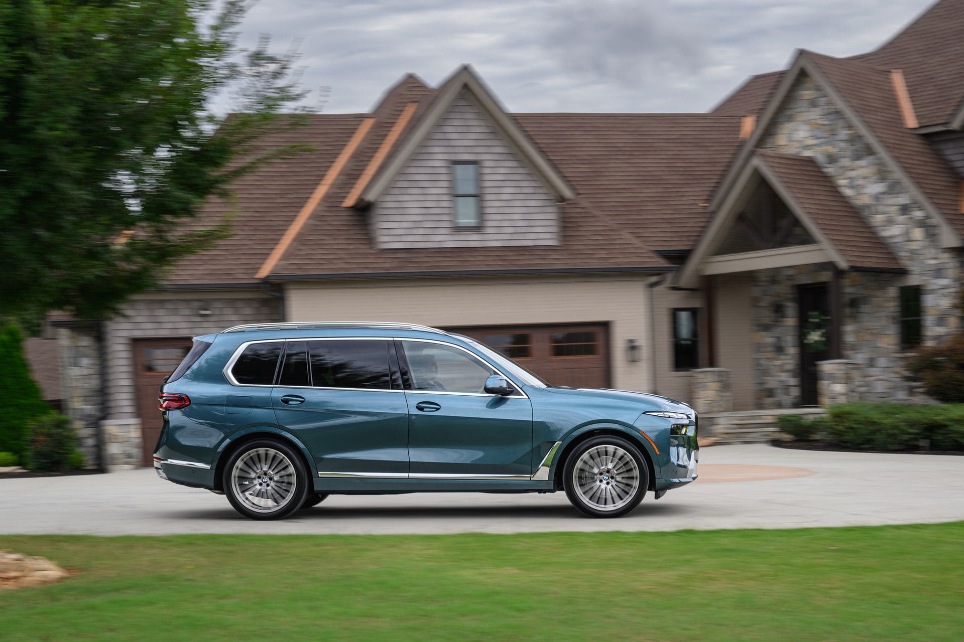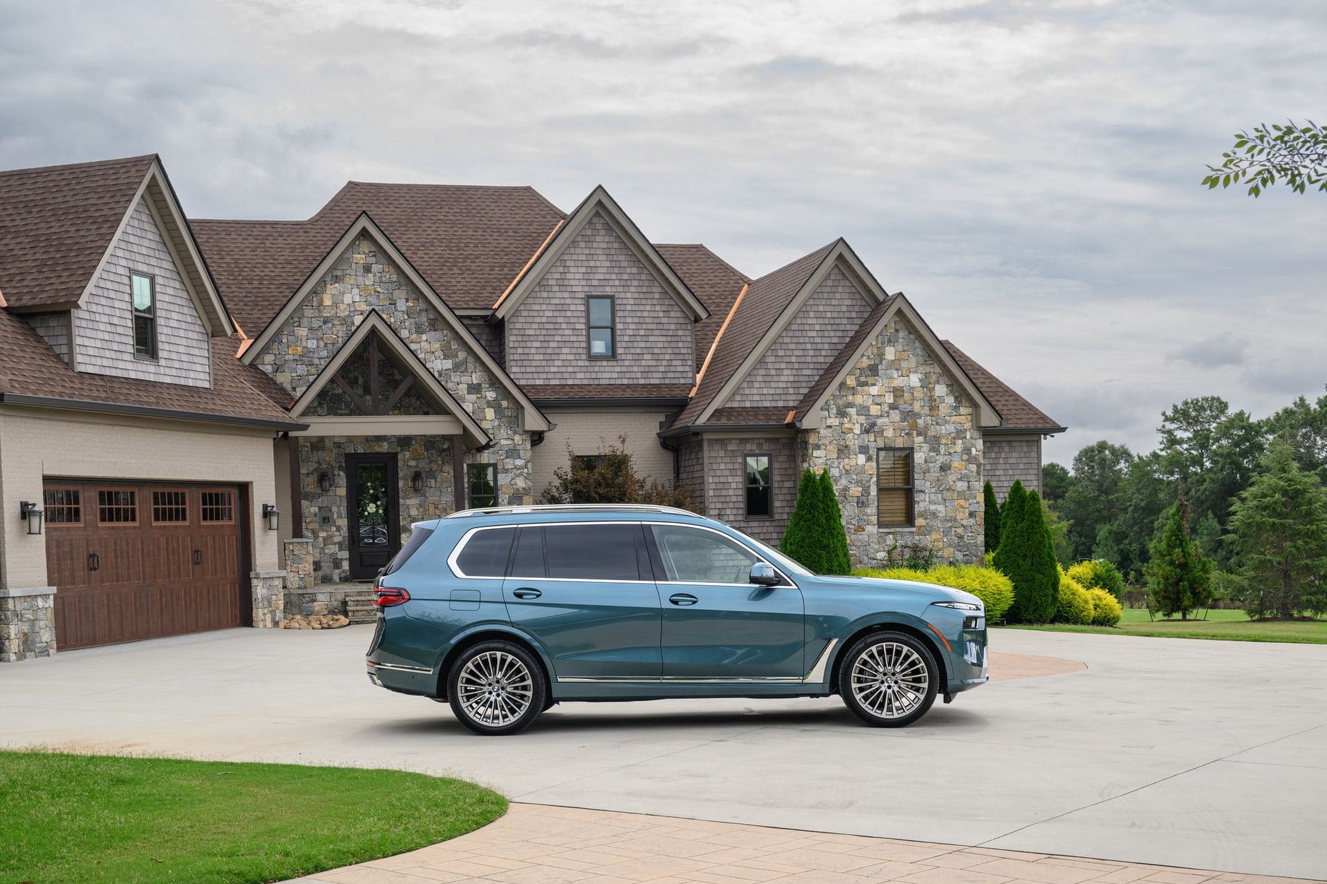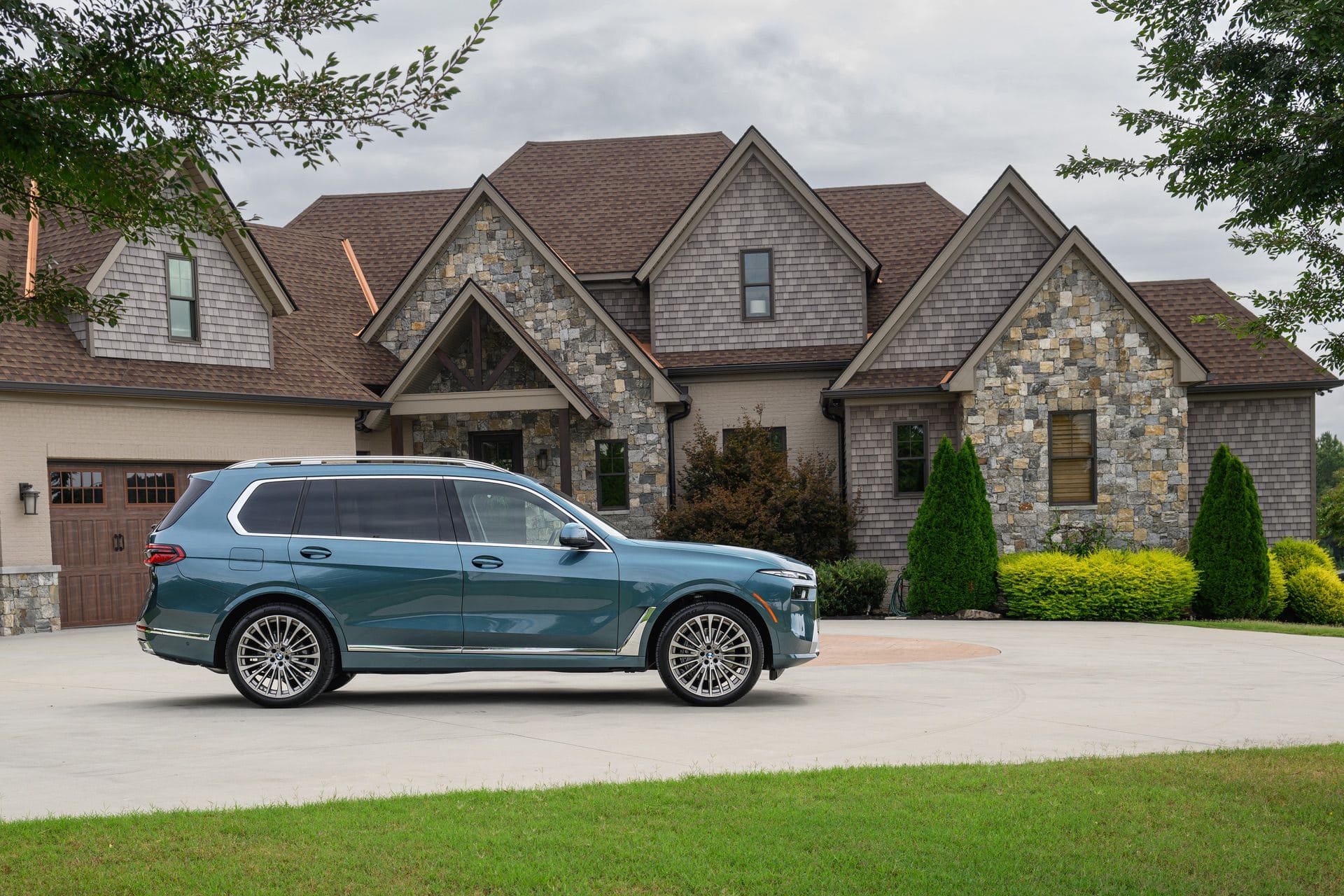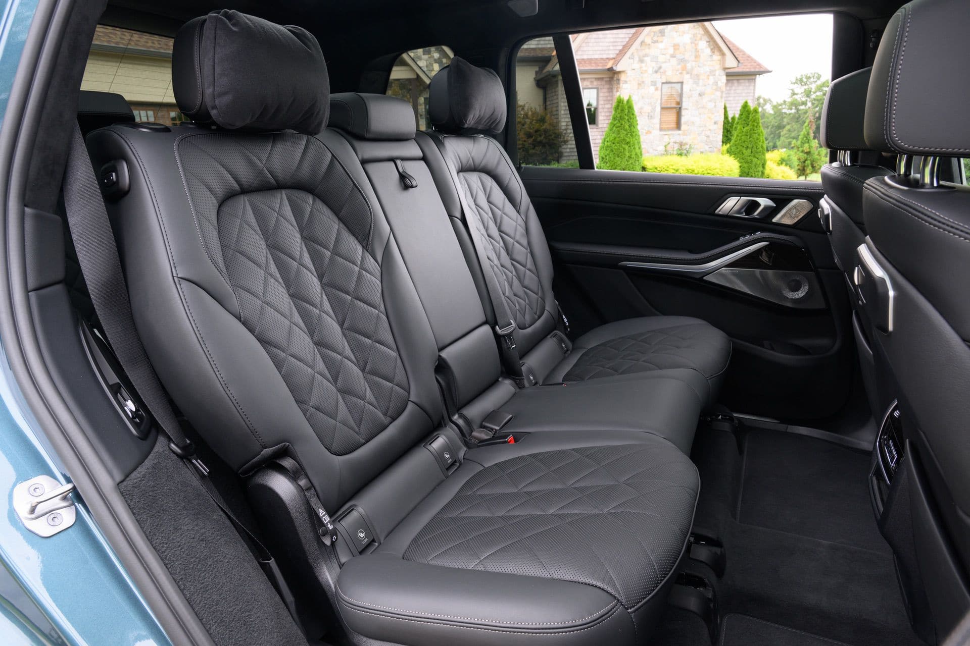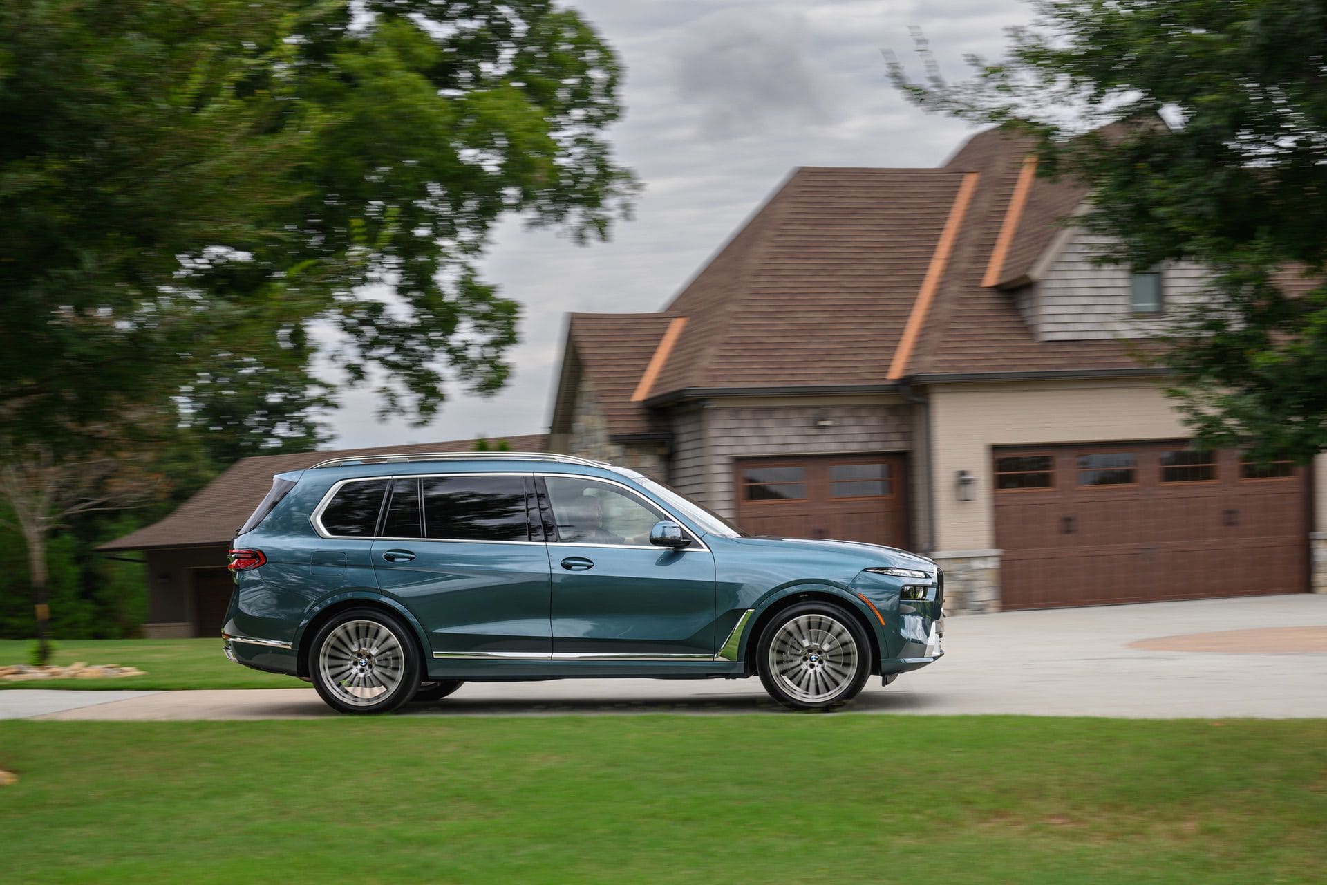 The BMW X7 in this photo gallery is wearing a Blue Ridge Mountain Metallic paint, which is named after the Blue Ridge Mountain range that runs near BMW’s Spartanburg, South Carolina plant. It’s a pretty color that works well with the X7’s enormous size. Inside, it’s black with wood accents and all of the X7’s new tech.
