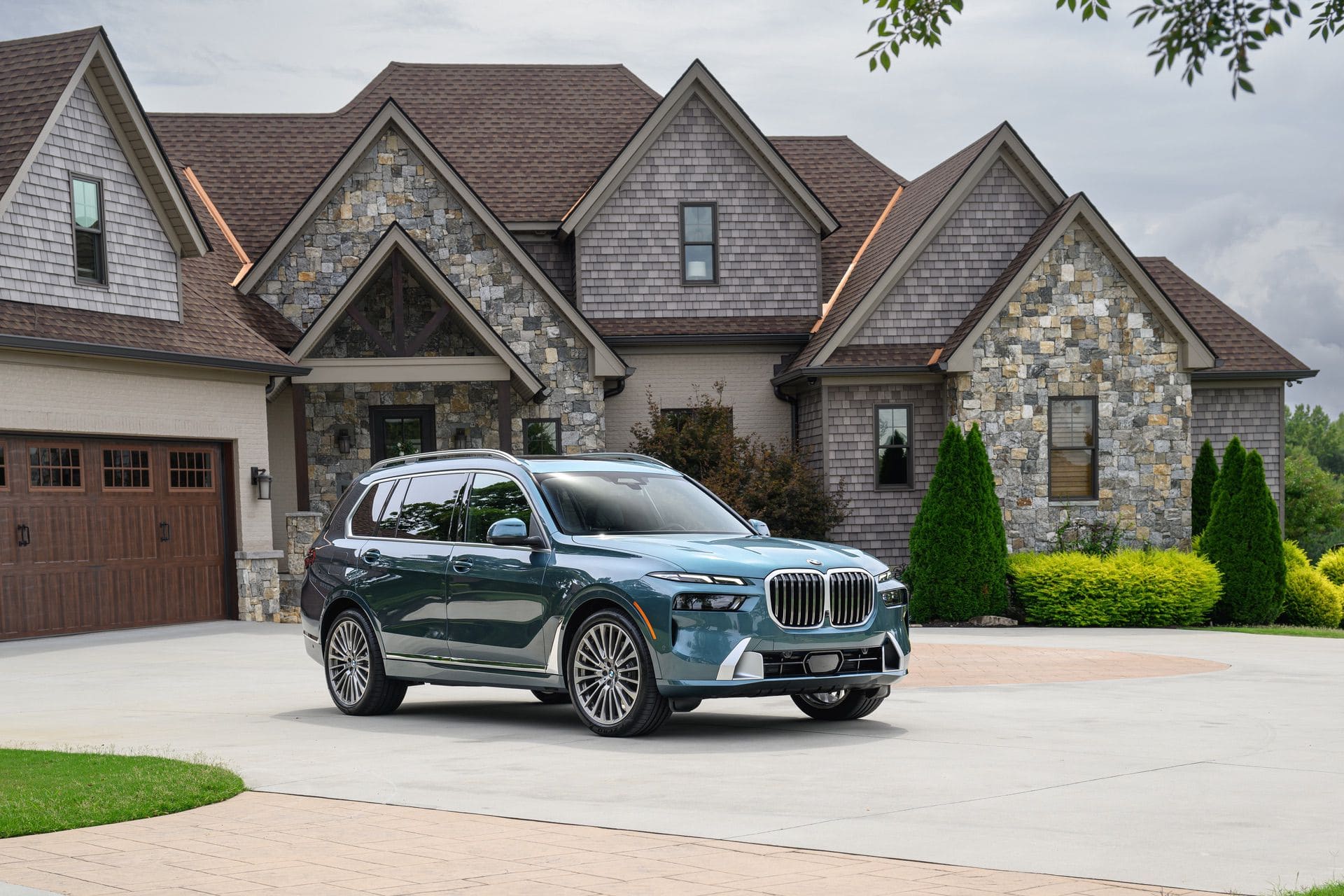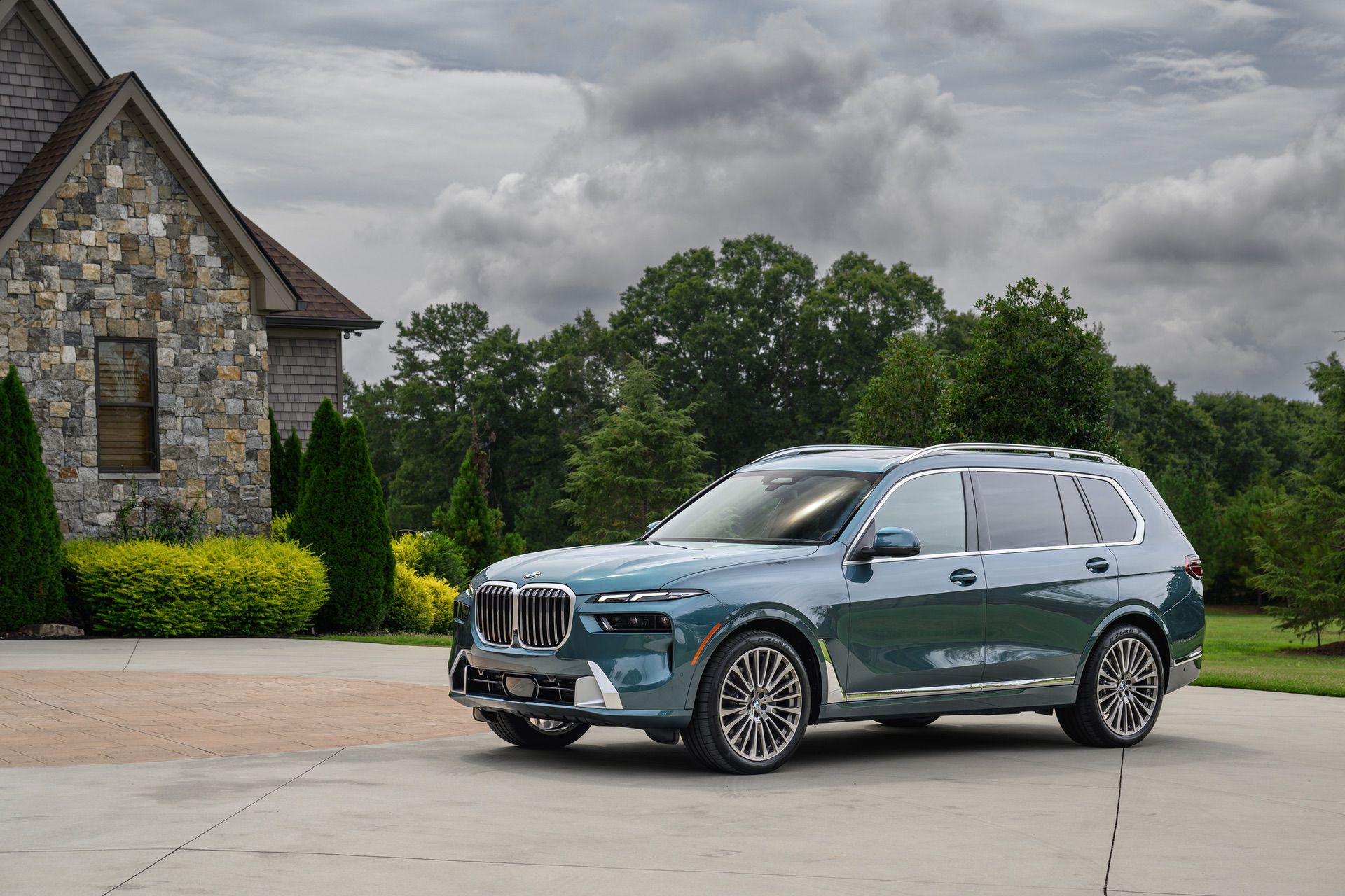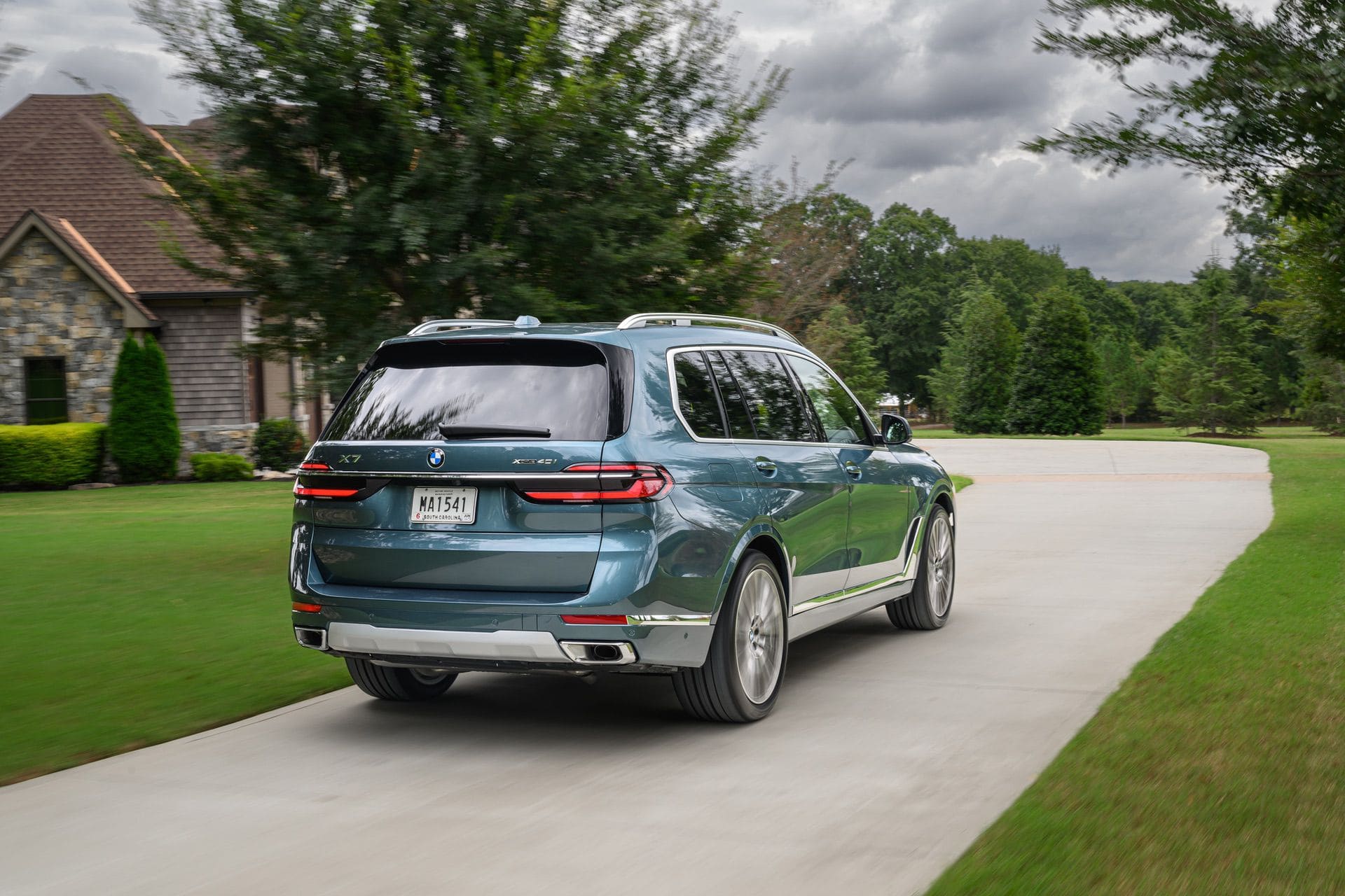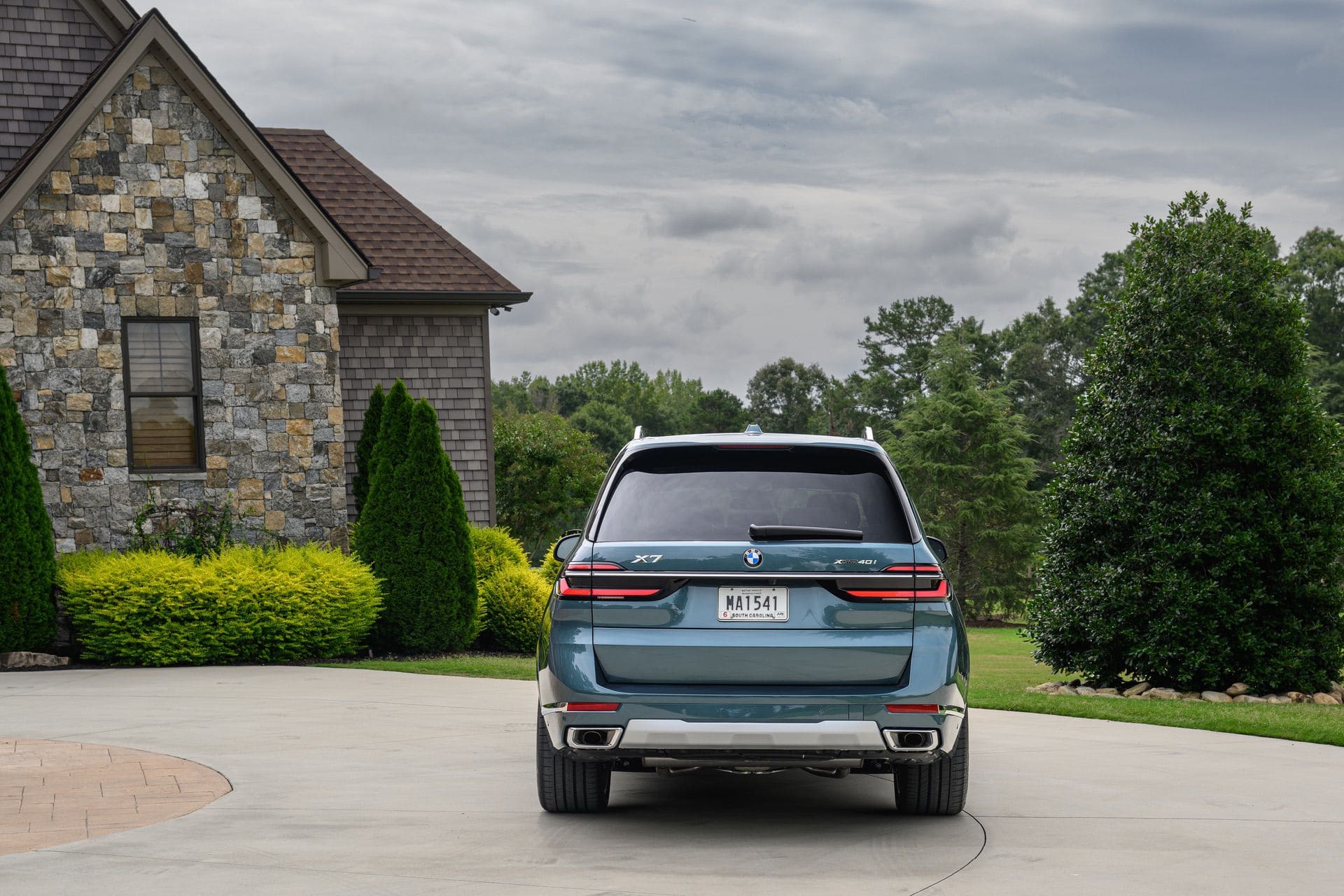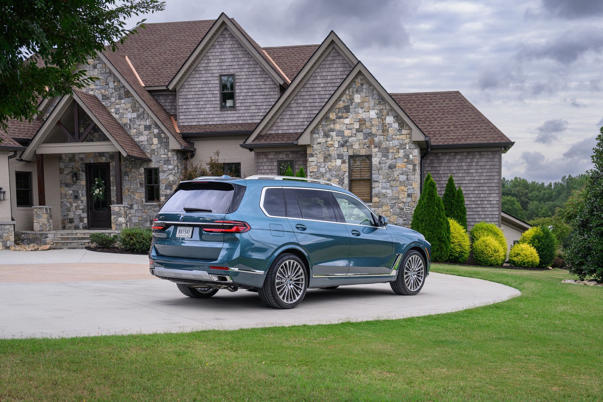 The BMW X7 in this photo gallery is wearing a Blue Ridge Mountain Metallic paint, which is named after the Blue Ridge Mountain range that runs near BMW’s Spartanburg, South Carolina plant. It’s a pretty color that works well with the X7’s enormous size. Inside, it’s black with wood accents and all of the X7’s new tech.