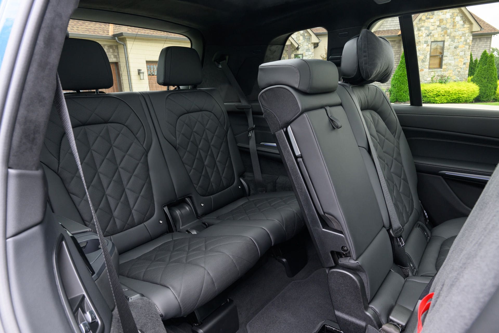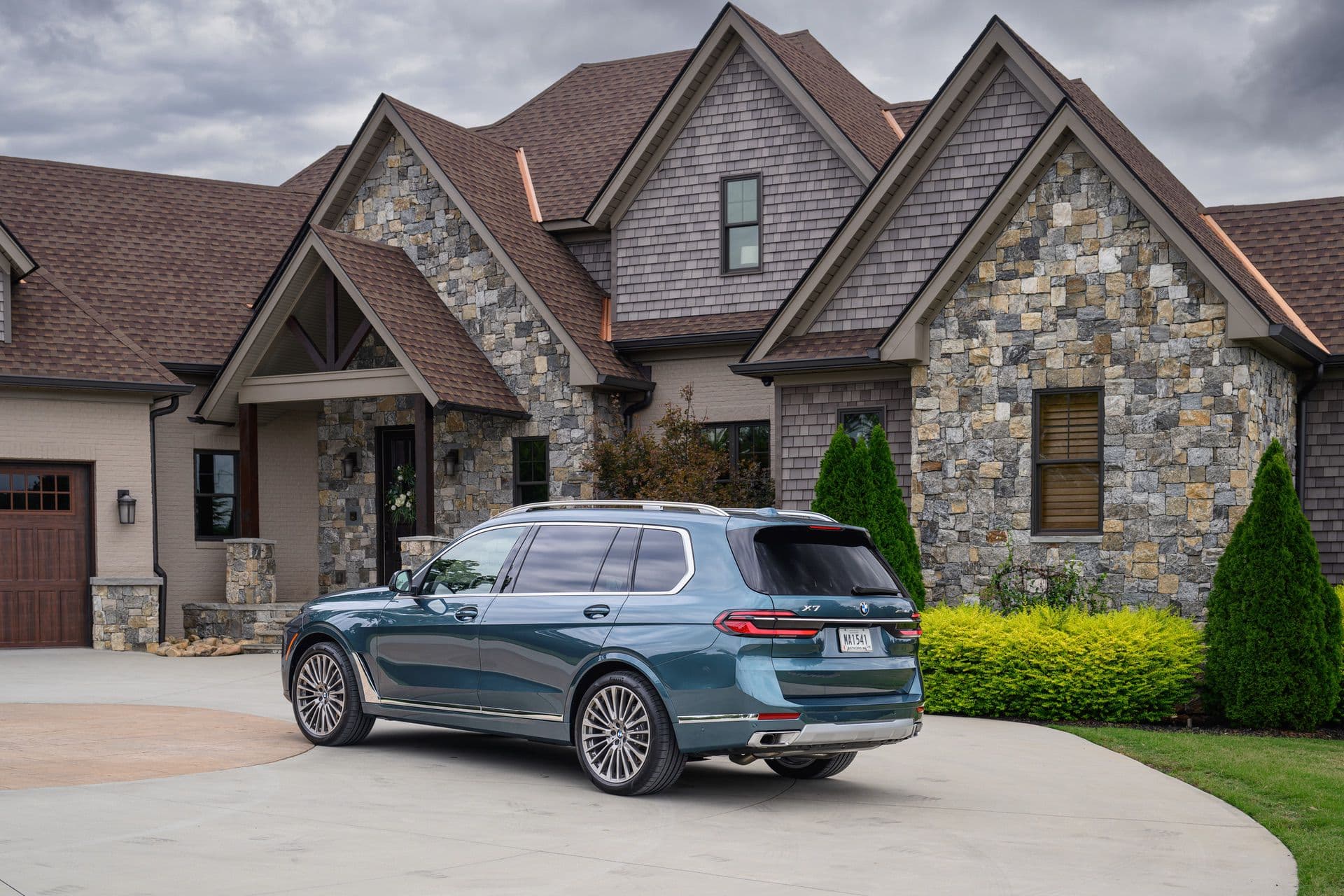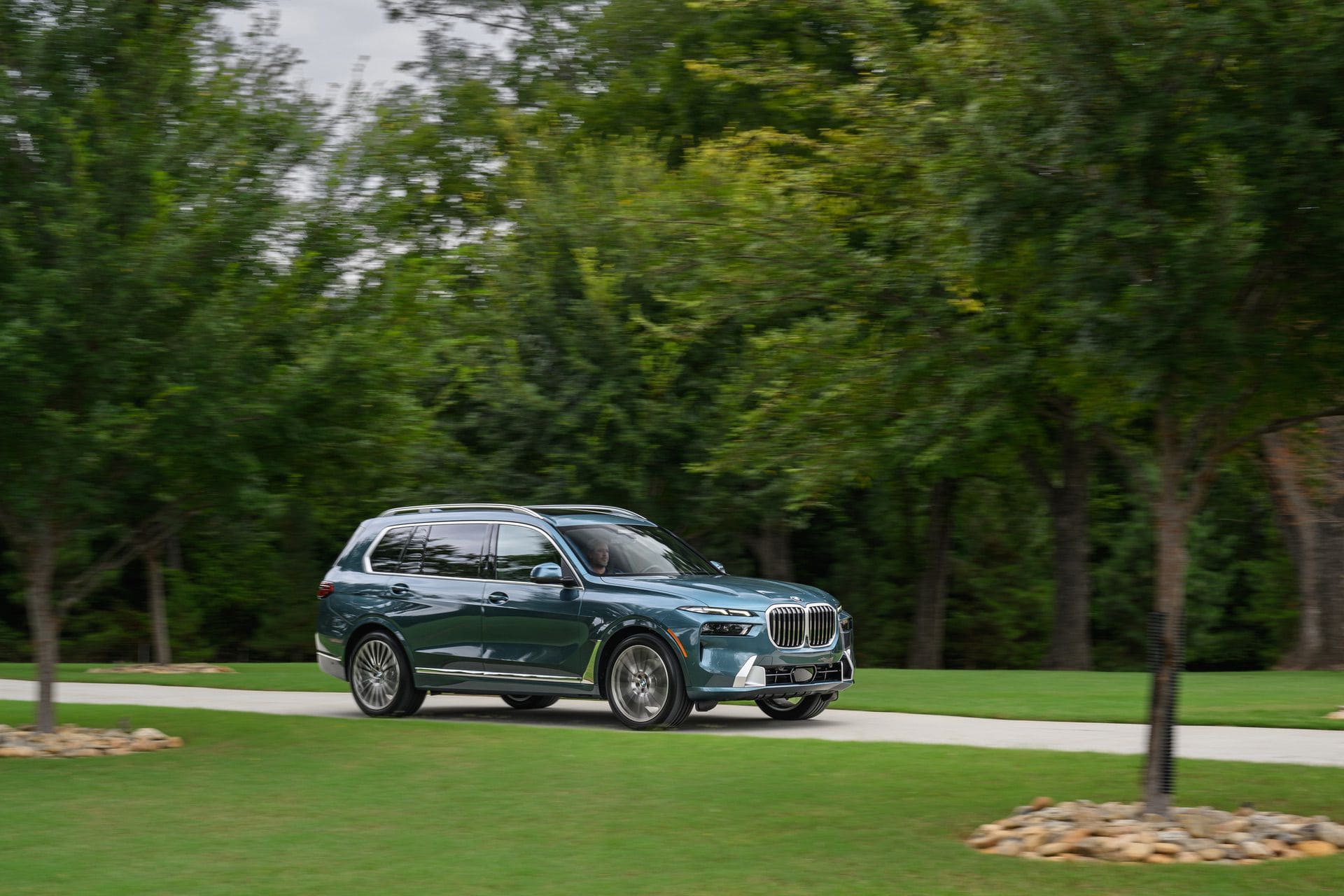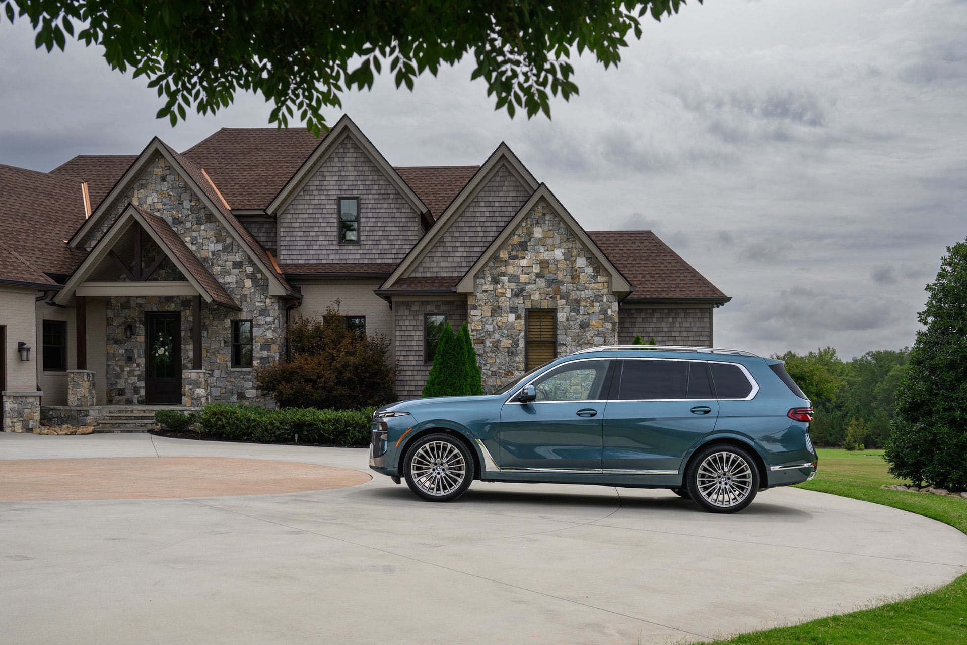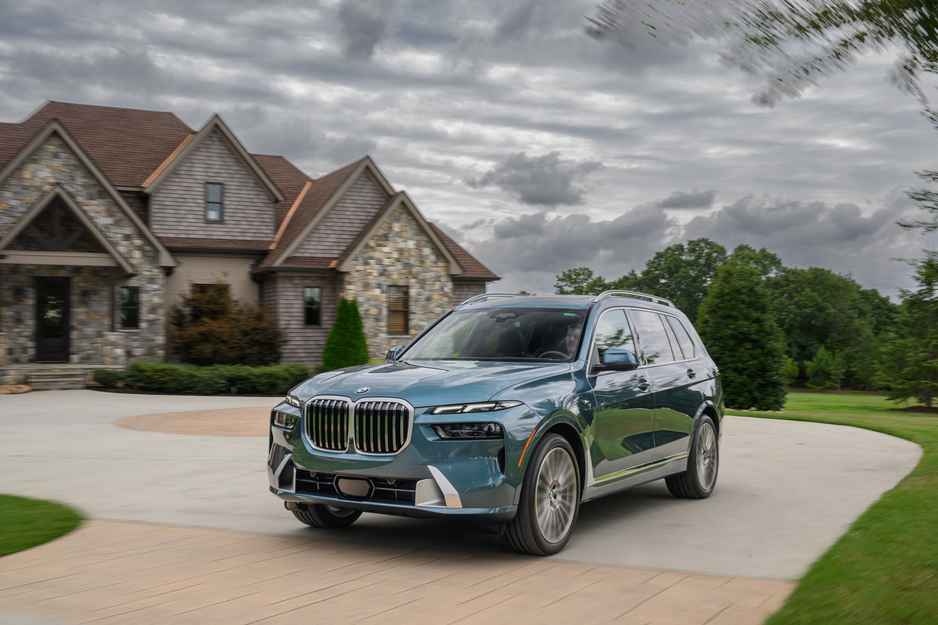 The BMW X7 in this photo gallery is wearing a Blue Ridge Mountain Metallic paint, which is named after the Blue Ridge Mountain range that runs near BMW’s Spartanburg, South Carolina plant. It’s a pretty color that works well with the X7’s enormous size. Inside, it’s black with wood accents and all of the X7’s new tech.