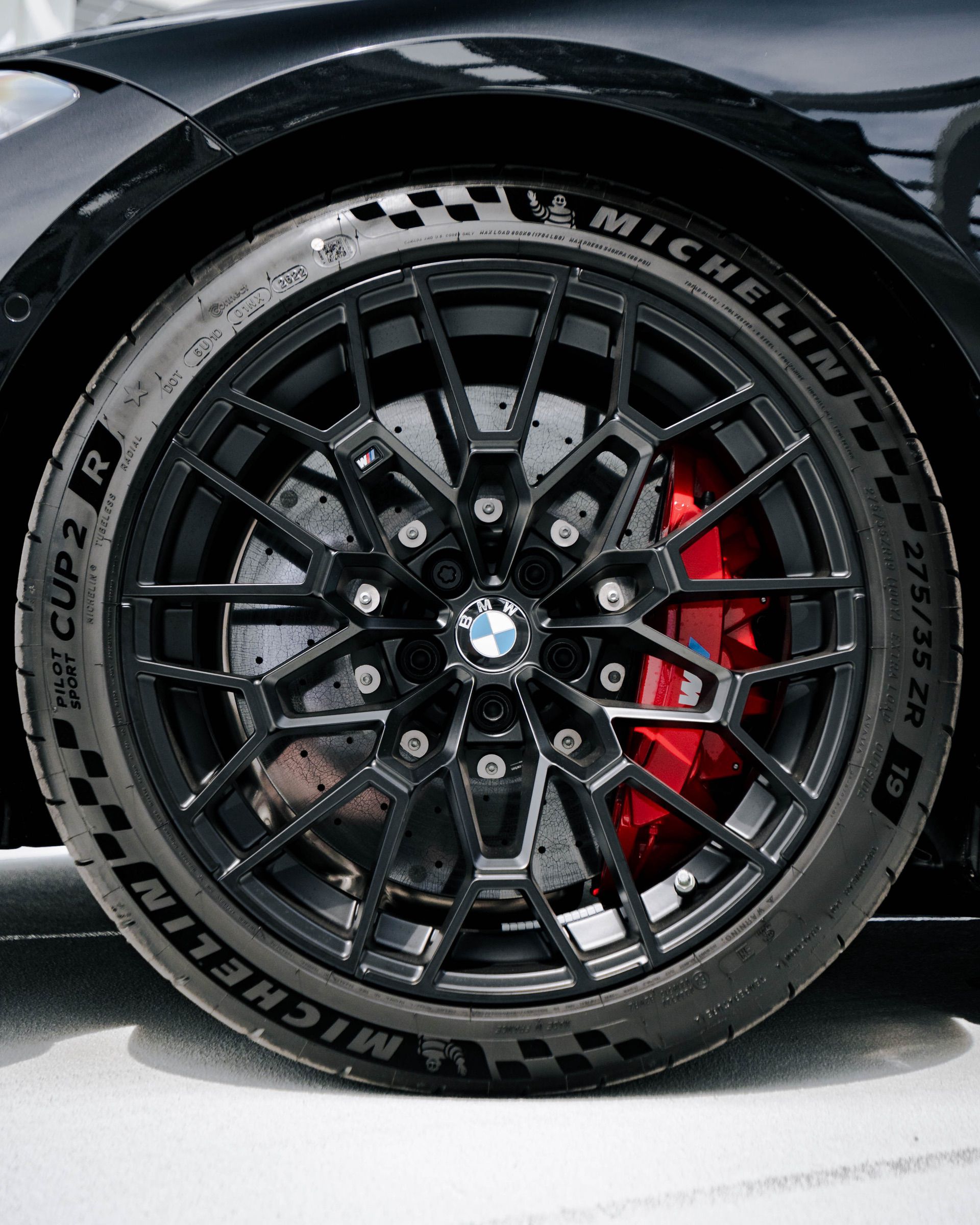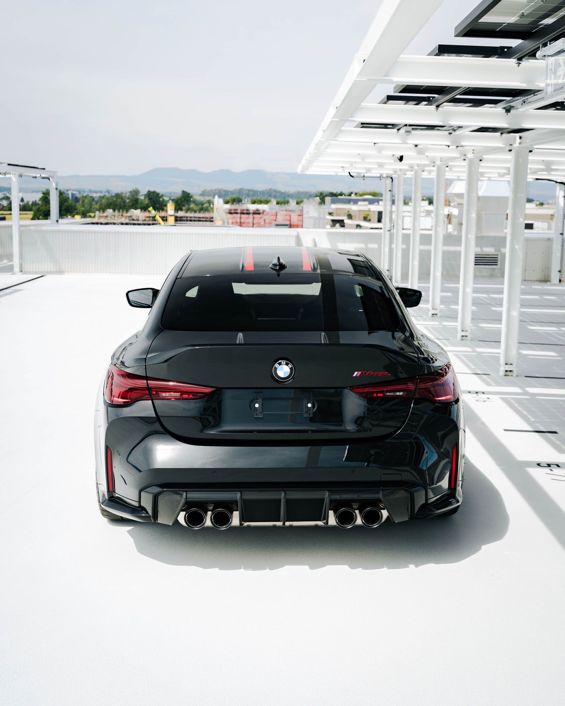 Seen here in this new photo gallery, the BMW M4 CSL is in Black Sapphire Metallic but it keeps the same grey hood stripes and red pin striping as every other CSL. So it has a very aggressive, menacing look. Those red accents are on the hood, on the side skirts, on the roof, and even on the badges. And because this car has all black wheels, those bits of red are the only flashes of color.