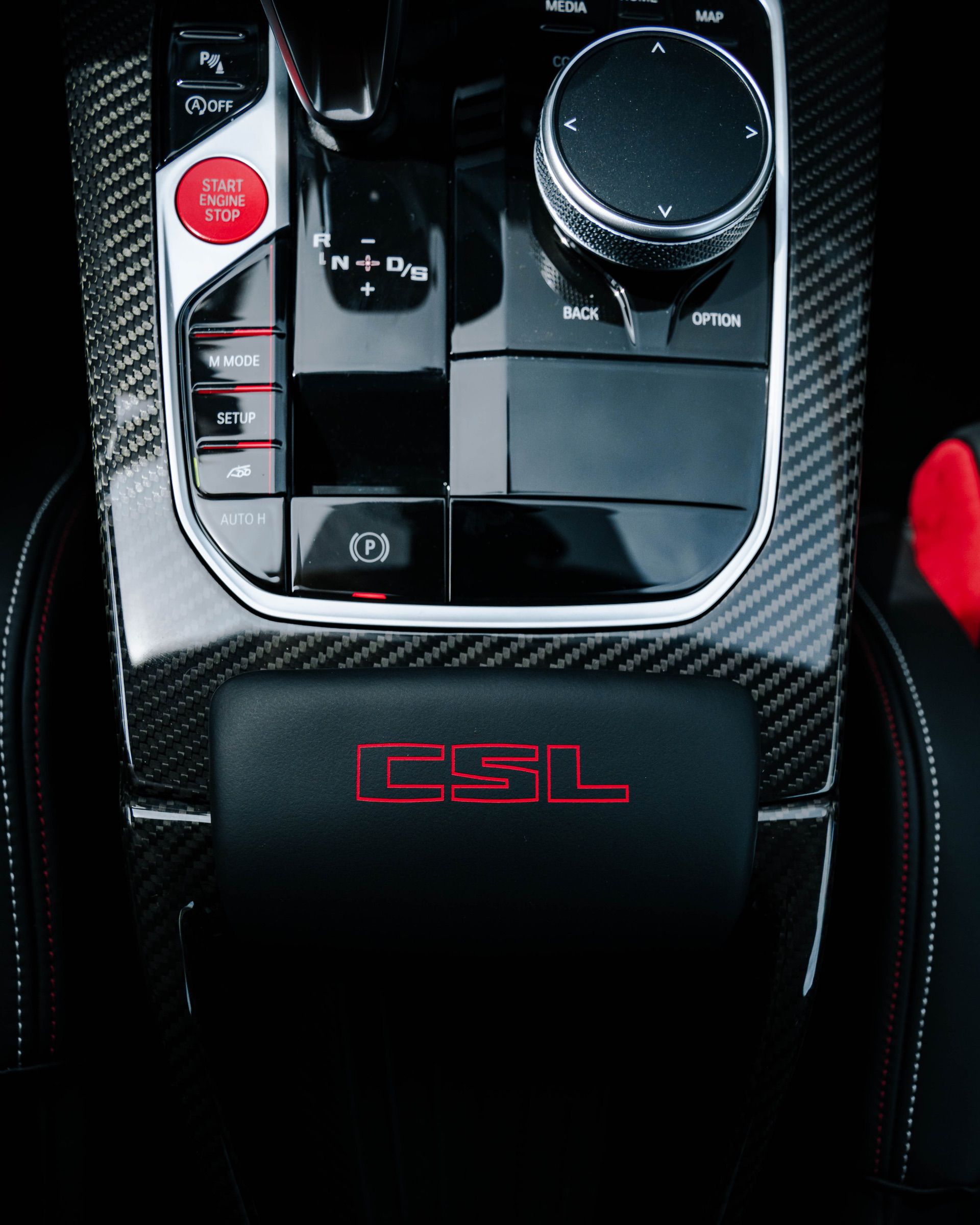 Same goes for the inside, where the cabin is almost entirely black, except for little bits of red trim and stitching here and there. The red can be found on the seats, the seatbelts, the “CSL” badge, and on the steering wheel. The wheel is Alcantara but gets a red 12 o’clock stripe, to add some pop. The only other color throughout the entire cabin is the subtle blue stripe on the seatbelts, to round out the M colors.