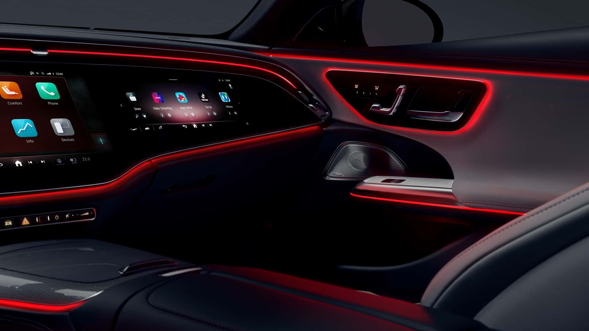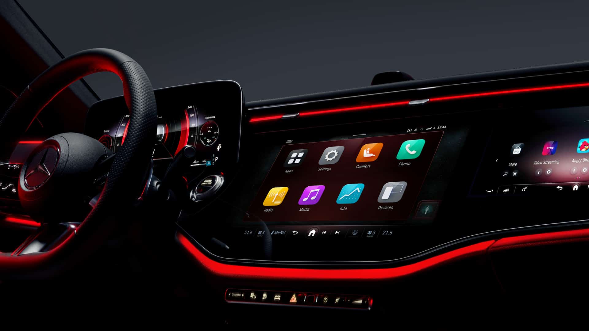 One look at the new E-Class cabin and it’s immediately evident that Mercedes is all-in on the Hyperscreen. The Hyperscreen is Mercedes’ massive new infotainment screen that spans the entirety of the dashboard. However, while it seems like one giant screen, it’s actually one giant housing with two screens inside. The main screen features the normal infotainment system, which seems to have a new UI design that feels like Apple CarPlay, with large, easy to click icons. There’s also a second optional screen just ahead of the passenger, which can control media and phone functions, as well as even play games like Angry Birds (way to be with the times, Mercedes).