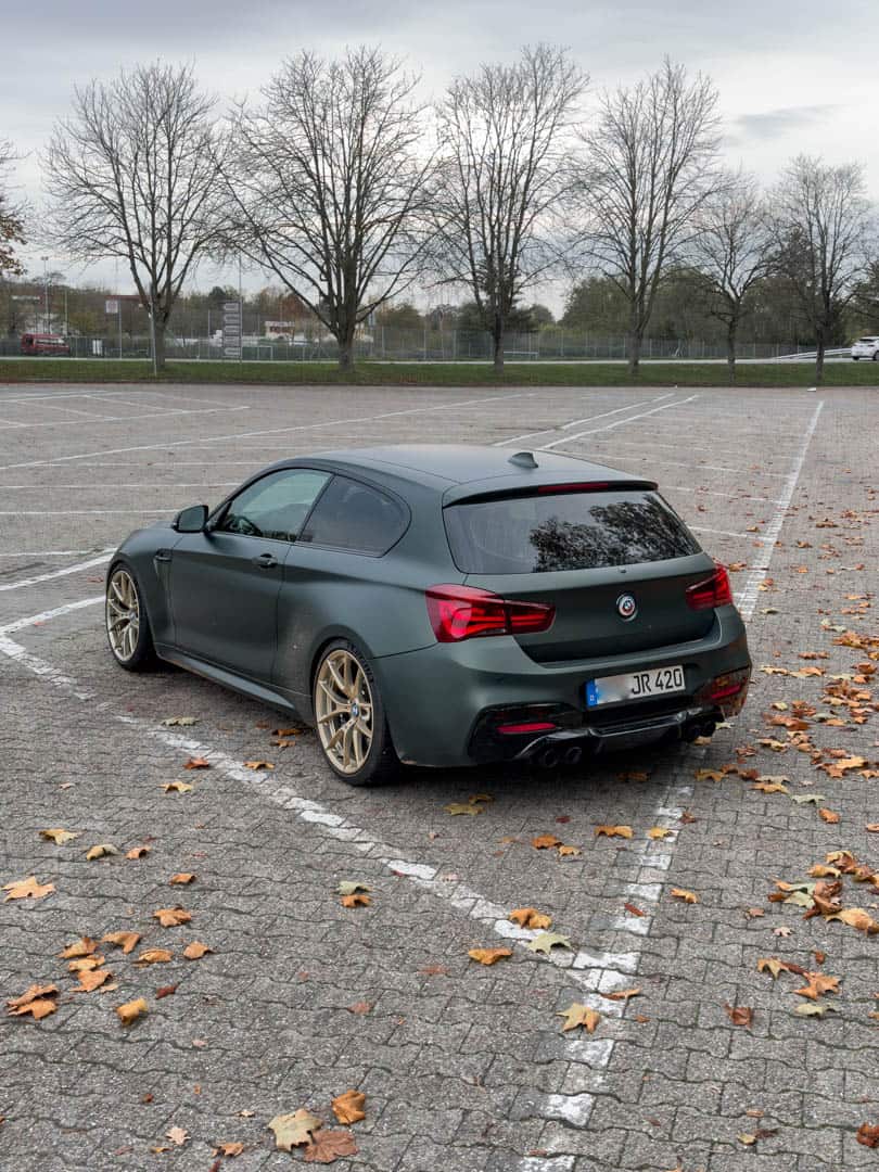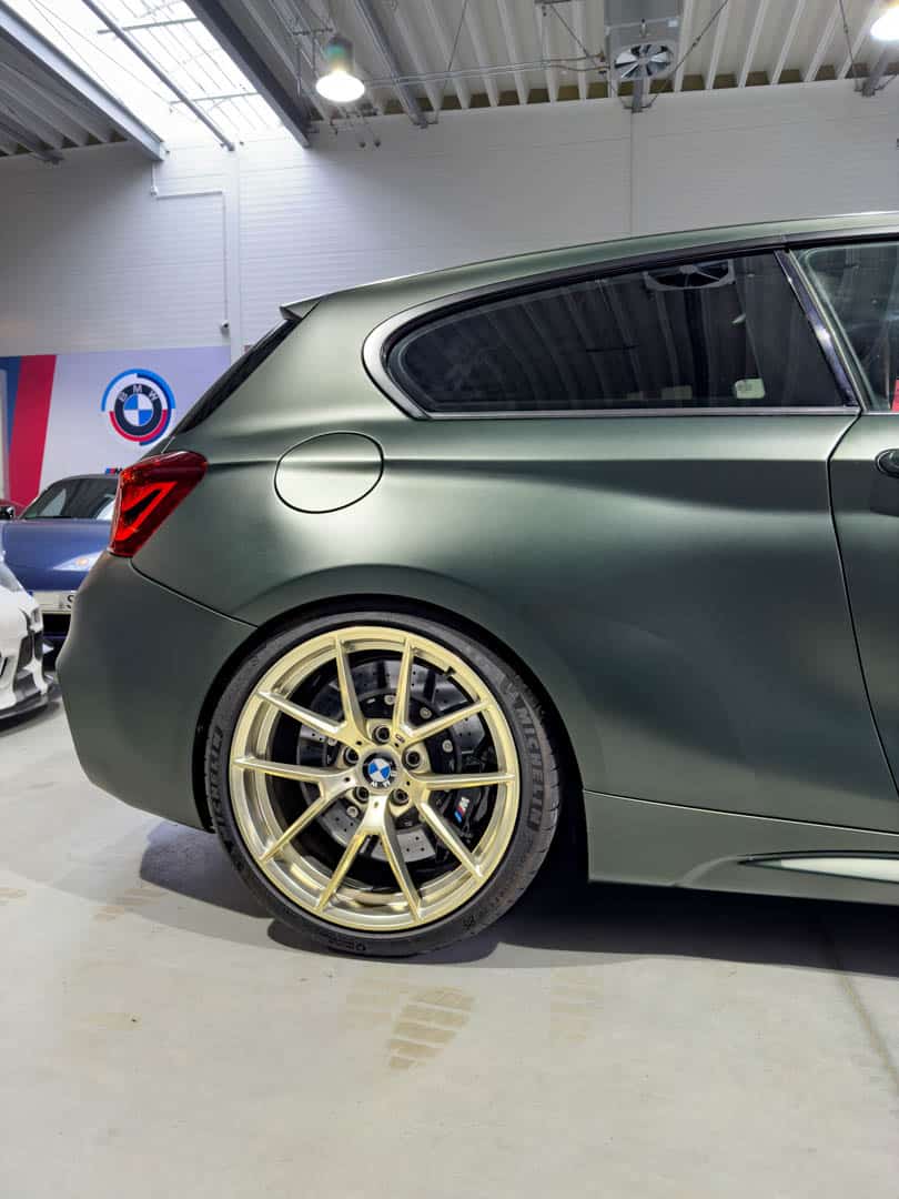 Let’s start with the looks because they belie its underpinnings. On the outside, this F21 looks like a BMW M2 CS hatchback. It has the front end—bumper, grilles, headlights, hood, and swollen front fenders—from the M2 CS. It also has the gold M2 CS wheels. However, it has the same Frozen Deep Green paint as the M5 CS. At the back, it has swollen rear fenders, too, giving it a proper M car look, but its rear bumper is from an M140i. Though, it has quad exhausts, not the M140i’s dual exhausts.