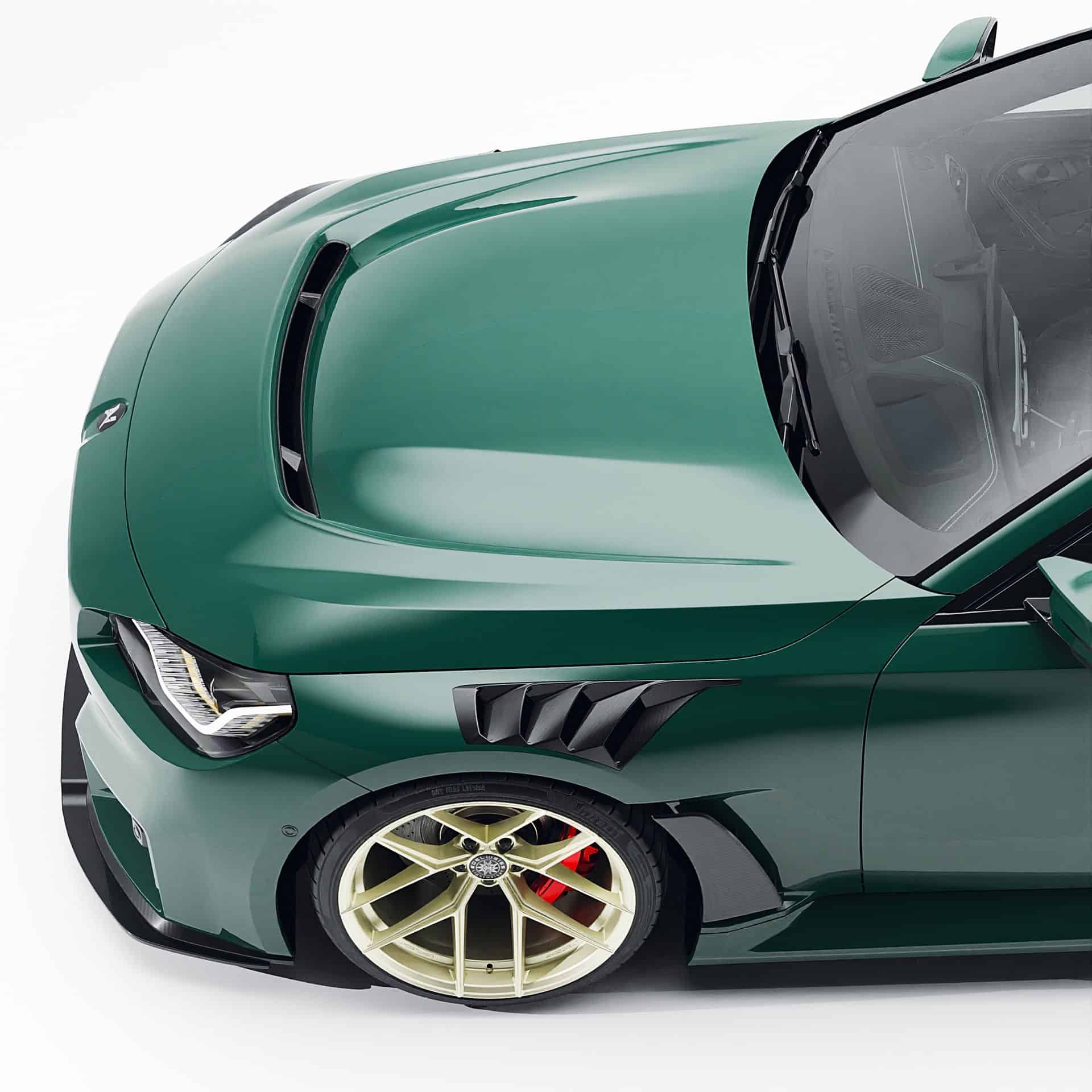 We’ll begin with what we think is the more interesting of the two since it takes after the M3 GT E36 with its British Racing Green paint and rear wing. Known as the M2 GT, it’s one of the most extreme packages we’ve seen so far for the second-generation M2 as it has everything from vented fenders to a front spoiler with an adjustable splitter. The hood, grille, diffuser, and engine cover are all made from carbon fiber while the Edelweiss wheels have a champagne color to contrast with the green body.