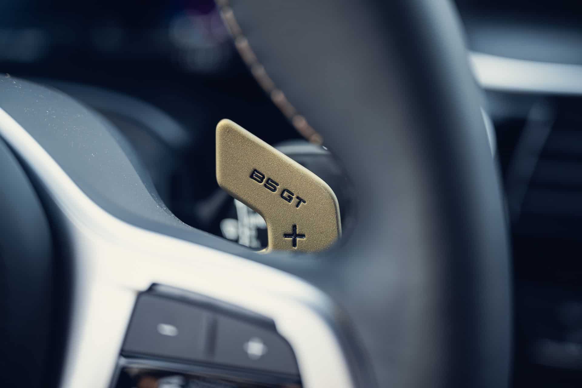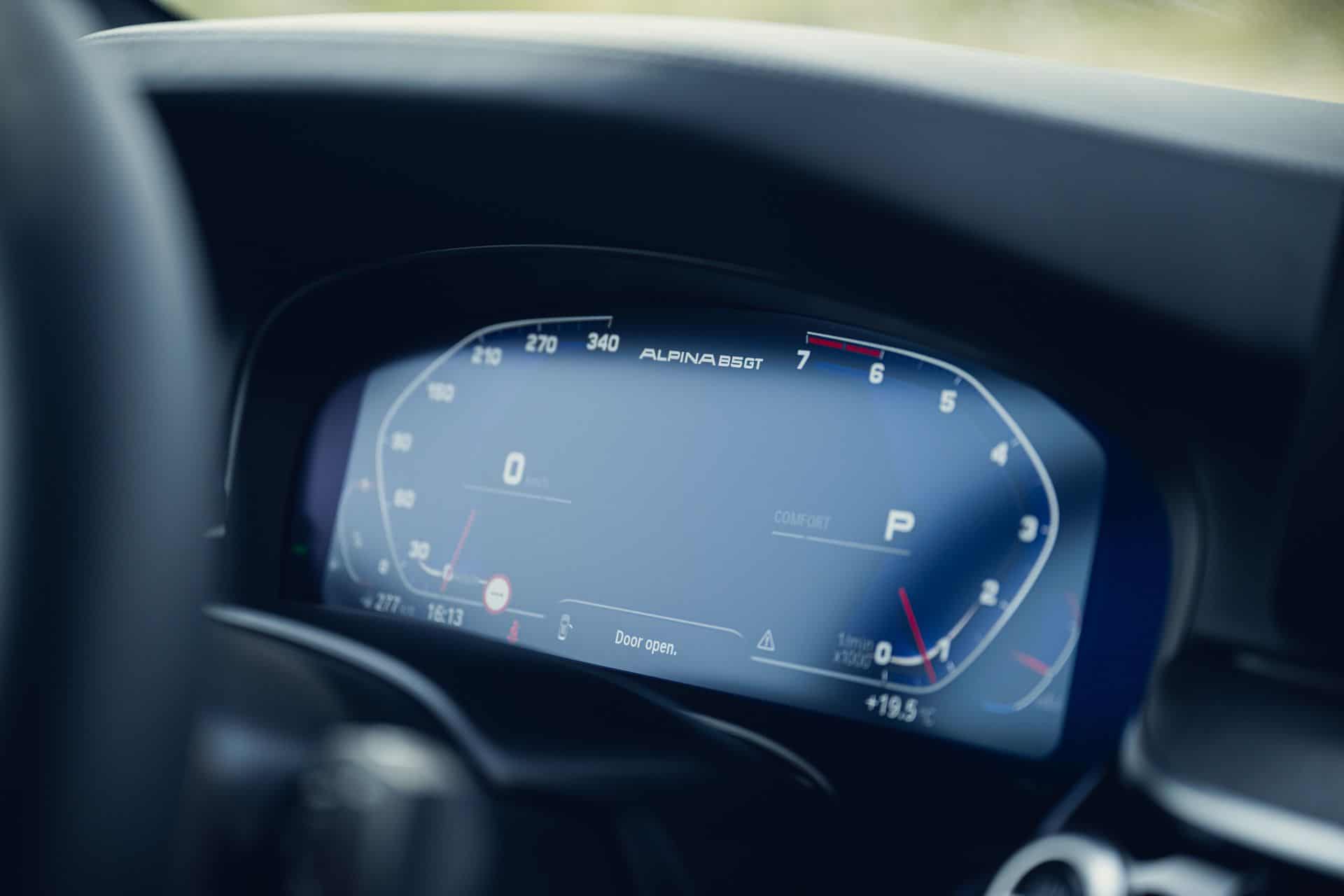 For those wanting ultimate customization inside the cabin, you can ask ALPINA‘s in-house saddlery to fulfill your dreams and create an individual full-leather interior made from LAVALINA leather. This is the same material you find standard on the steering wheel, which comes with Marron Volciano stitching – a stitch color which proved to be totally out of tune with all the other blue stitching inside the interior. The final touches are the ALPINA-themed digital dash, open-pore wood trim on the dashboard, B5 GT emblems on the floor mats, and bespoke aluminum shift paddles, painted in the same Marron Volciano.