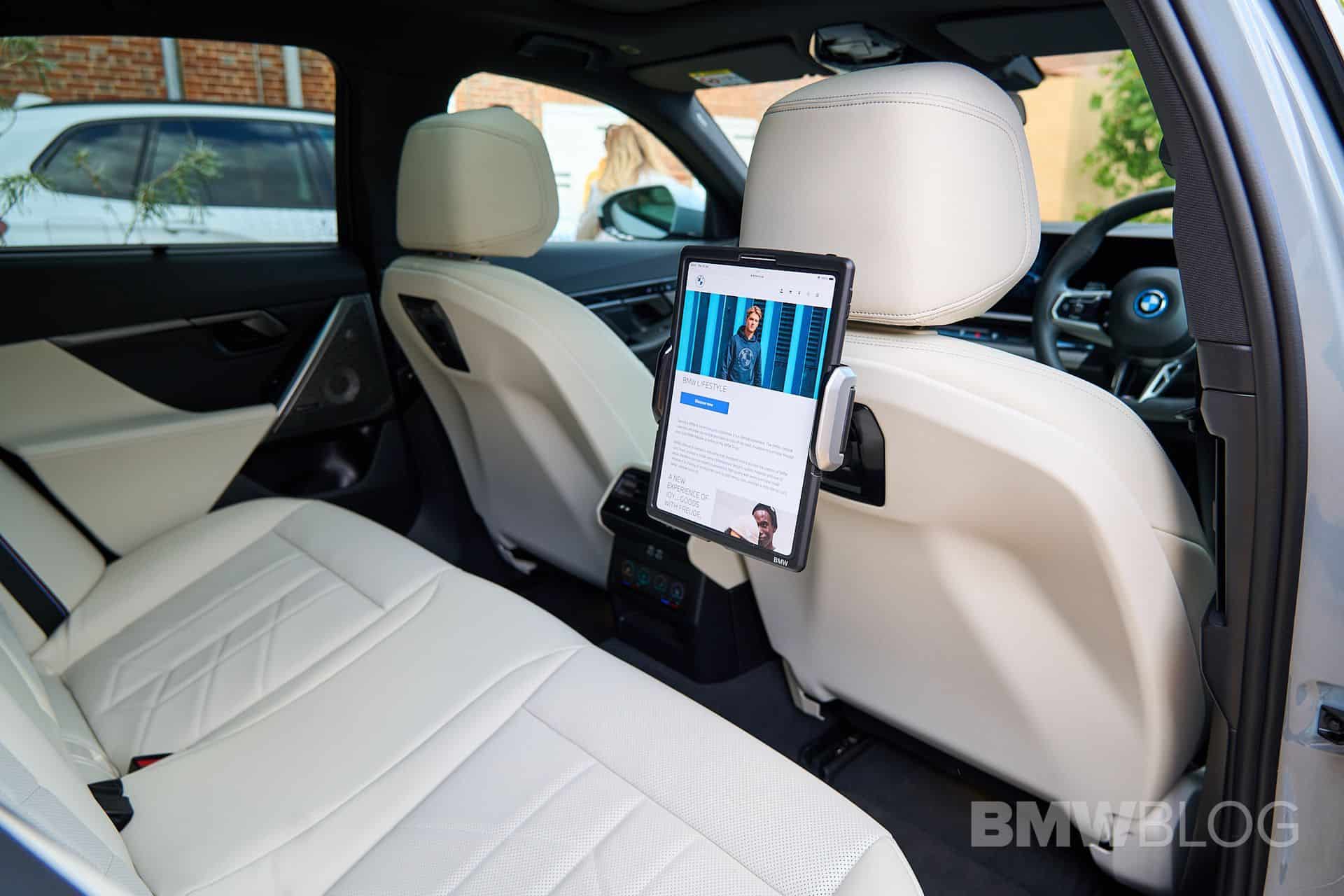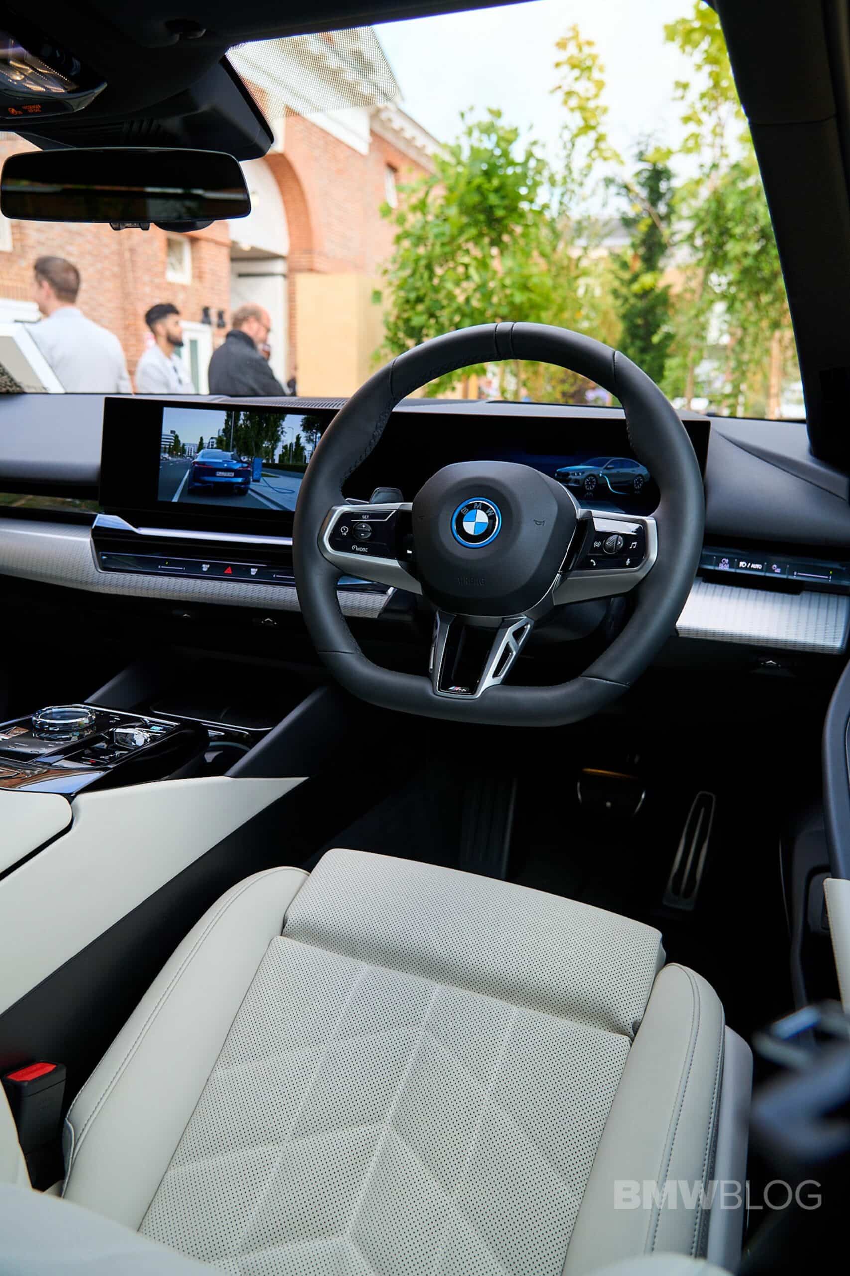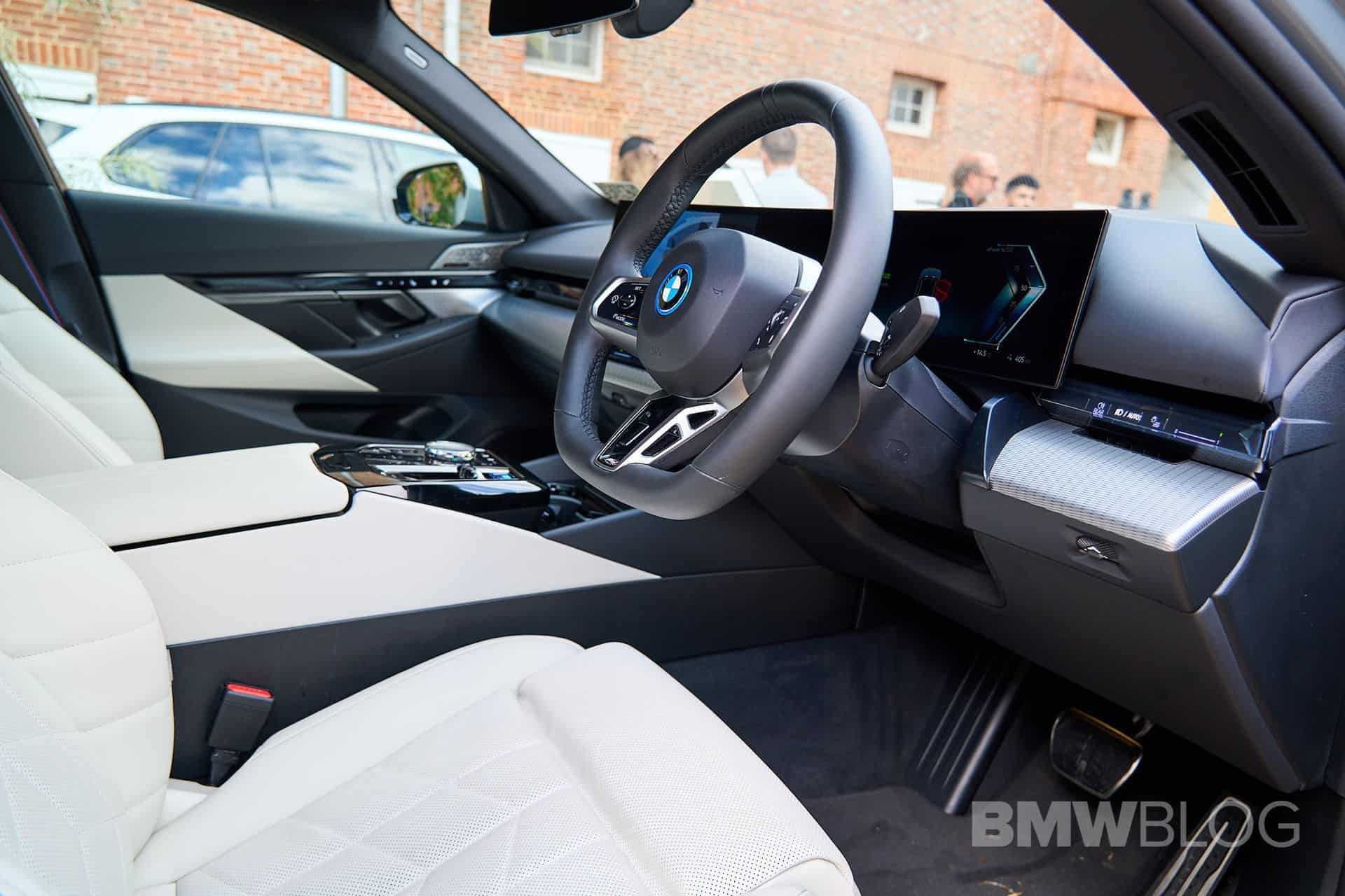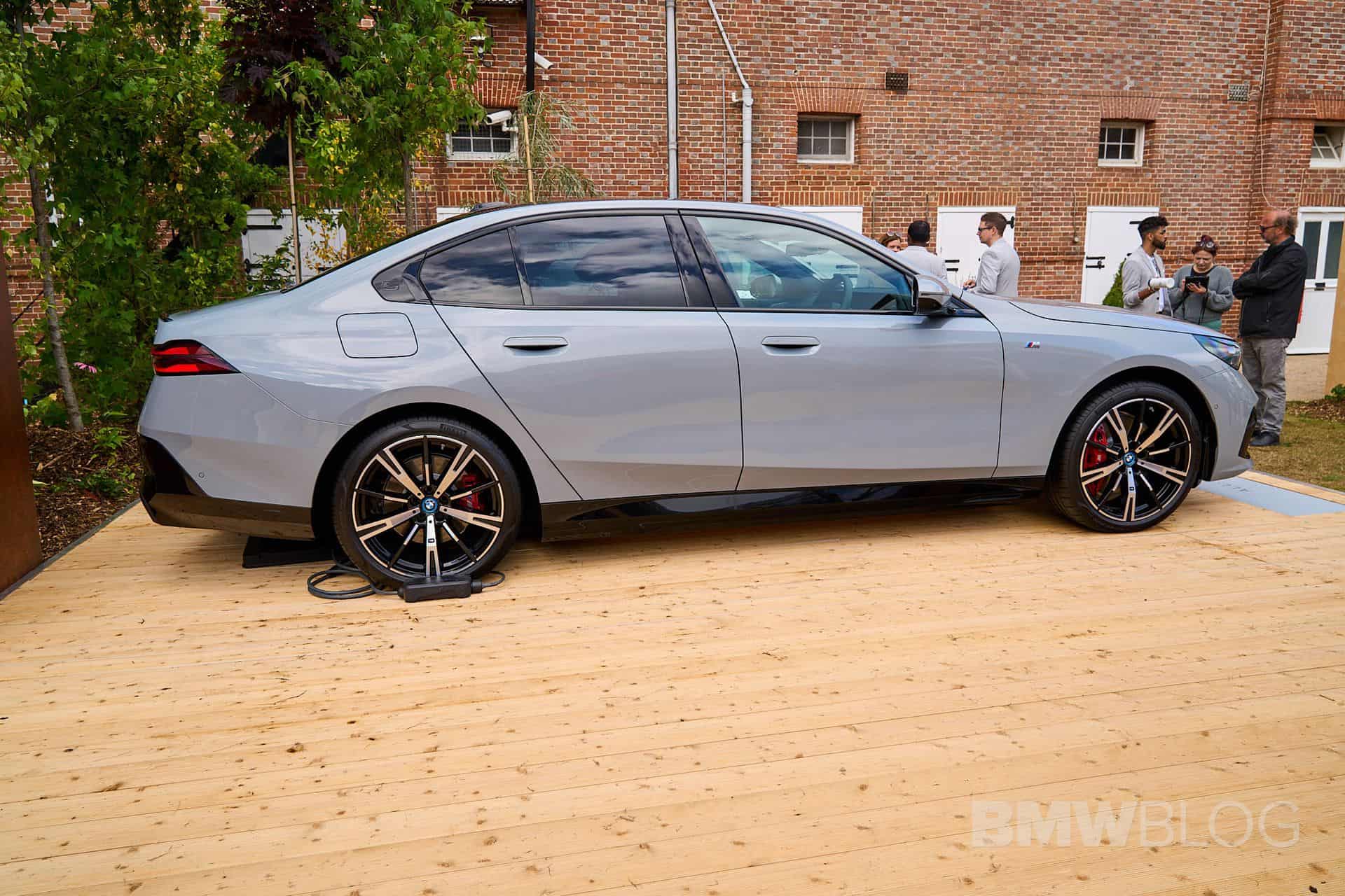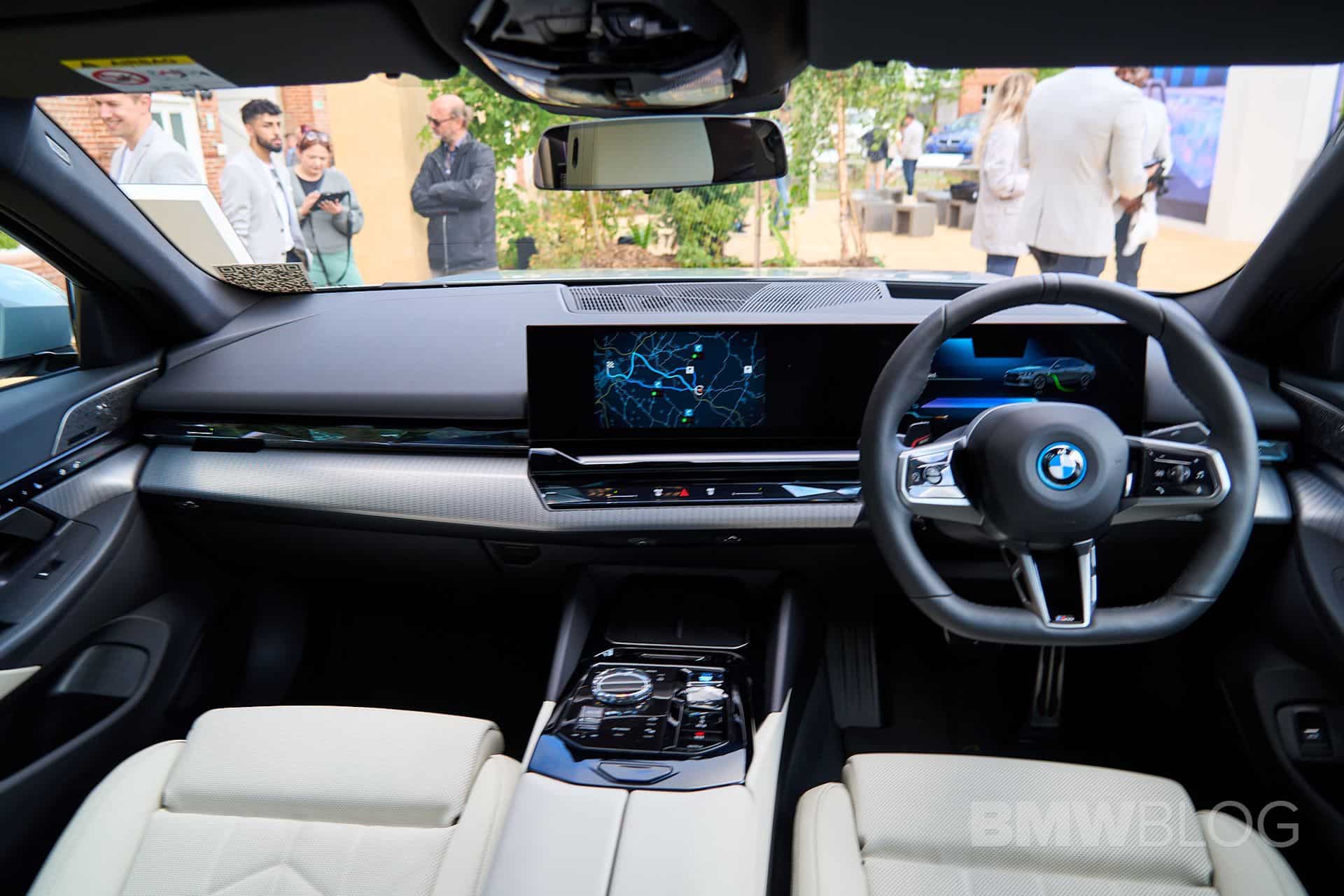 This i5 is not completely standard since it has a few upgrades to make it look better at the event. For starters, it’s dressed in M Sport attire – a $3,000 option in the US – with a Brooklyn Grey paint, 20-inch two-tone wheels, and red brake calipers. Naturally, BMW brought a right-hand-drive car to the event, featuring Smoke White upholstery. That’s actually Veganza, which is marketing speak for vegan leather. In fact, the 5 Series G60 is the company’s first production car to offer a truly vegan interior.